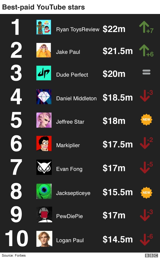 Here is a list of the YouTubers who fill out the top 10 spots, courtesy of BBC.